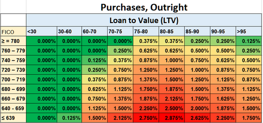 As you can see, if you have a score of 640, you’ll be paying significantly more than if you had a score of 740. Using an 80% loan-to-value ratio as an example, your LLPA at 640 is 2.25% versus 0.875% for a 740 score. That’s a 1.375% difference, which is just over $4,000 on a $300,000 mortgage. That’s a big change.
